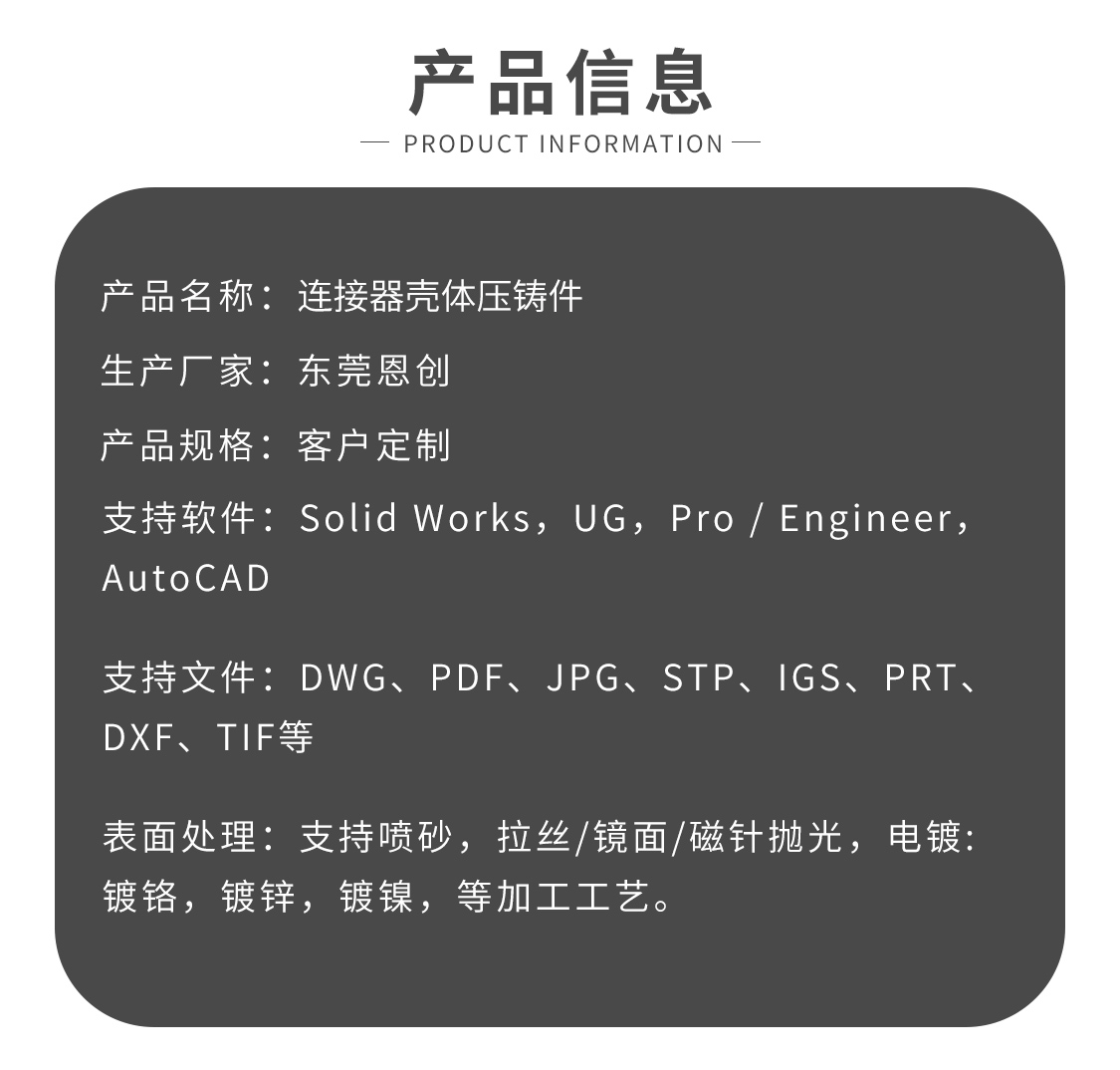 恩創(chuàng)精密壓鑄鋅合金連接器殼體,連接器外殼壓鑄件,已為多個連接器廠商提供連接器殼體生產(chǎn),精密壓鑄,公差可達(dá)正負(fù)0.002.表面處理鹽霧要求最高可達(dá)720小時,連接器殼體貫穿孔CCD全檢。